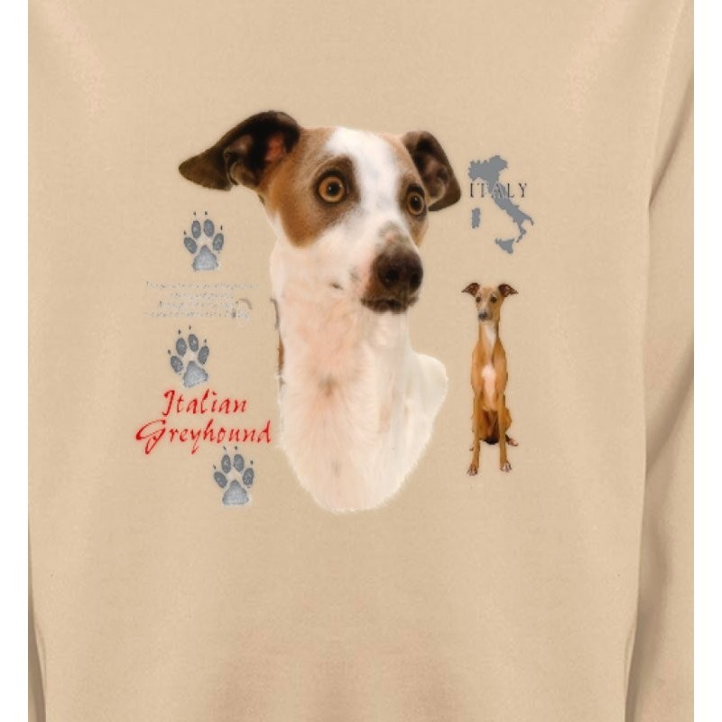 T-shirt ou sweat Shirt illustration face et profil avec mention Levrier Italien, empreintes et silhouette de l'Italie sur pandalook.com (possibilité de répartir les éléments de l'illustration où vous le souhaitez sur le support, à préciser lors de votre commande)